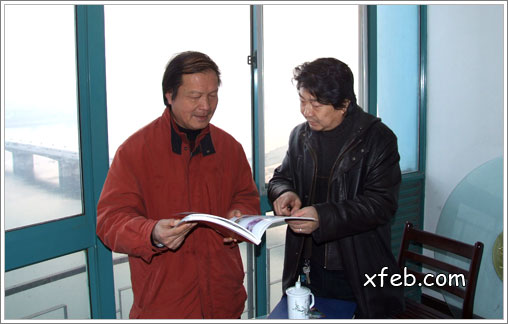 襄樊油画家研究会黄亚东会长正在给襄樊市作协主席段明贵介绍在法国卢浮宫画册的参展情况