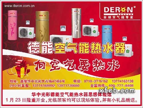 德能空气能热水器,向空气要热水 地址:襄樊市华中光彩大市场47栋6号德能空气能热水器思想体验馆 销售热线:400-777-8408 13774169992 24小时客服:15872208008 传真:0710-3392948 咨询QQ:542646936