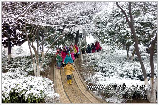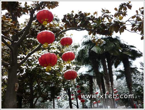在春雪覆盖的新华游乐园,白的是雪,绿的是树叶小草,那火红的是灯笼。那池边的垂柳,还有在自由自在玩耍的小朋友。