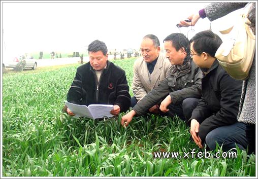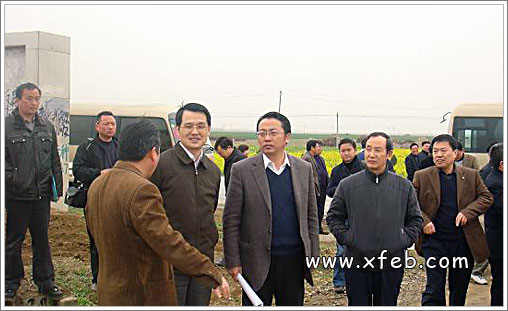 湖北省质监局副局长周德文(左二)、襄樊市质监局局长陈运喜(右一)、襄阳区委常委副区长朱志坚(左三)在伙牌镇田间地头观看农业标准生产情况