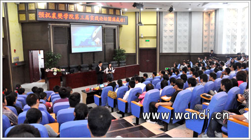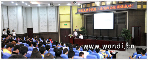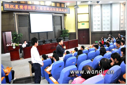 2010年5月27日下午4:30,襄樊学院第三届实践论坛在行政楼报告厅隆中举行。本次活动由共青团襄樊学院委员会主办、襄樊学院建筑工程学院、建筑工程学院分团委学生会、襄樊学院实践公关学社承办。为让在校大学生能够更好地了解外界社会形势,围绕学校培养人才的方向,特以小组形势对社会各界进行调查分析,透析大学生“初入社会,独立自主如何取舍?”这一深刻话题。各小组成员代表各学院、个人,进行了慷慨激扬的报告。