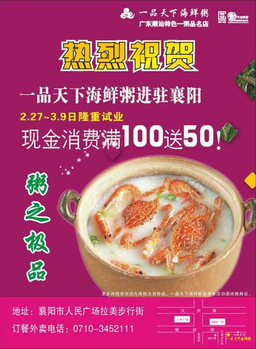 2011年2月27日,一品天下海鲜粥城开业啦,欢迎光临。