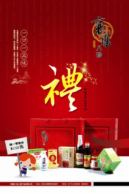 襄阳八珍是《魅力襄樊》旗下襄樊八珍土特产品有限公司融合了古城襄樊及所辖各县市区域内最有代表性的八种土特产品于一体的组合型礼品包装,为继承2800年历史底蕴,弘扬悠久的襄阳古城文化精心组合而成。悠久、深厚的历史文化底蕴,赋予了这些土特产的内在气质:襄樊龙头产品大头菜;百年陶记金刚酥;源远流长枣阳地封黄酒;深山珍品保康鲊胡椒;湖北腐乳之乡谷城茨河豆腐乳;历史秘方老河口丹河稠酒;文化积淀南漳黑芝麻油;荆楚名品宜城皮蛋。通过我们的组合、包装,襄阳八珍已经成为代表襄樊特色的高级礼品,固有的土特产品的理念得到升华而成为商品,将襄樊悠久的历史文化蕴含其中,形成一种独特的、能够被消费者接受的馈赠佳品。