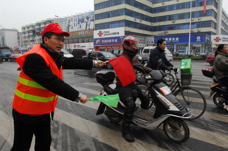 12月16日,襄樊市近10名青年企业家走上街头,为市民提供文明交通服务。