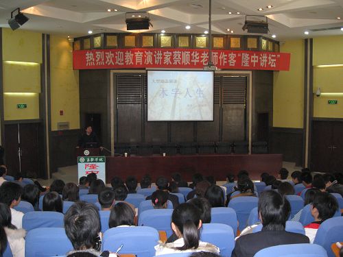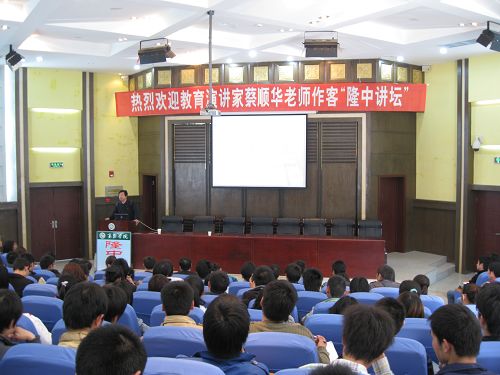 3月17日下午,学校行政楼一楼报告厅掌声不断,笑声不断。教育演讲家蔡顺华老师应邀作客我校“隆中讲坛”,在这里为同学们带来一场以“木字人生”为主题的精彩演讲。
