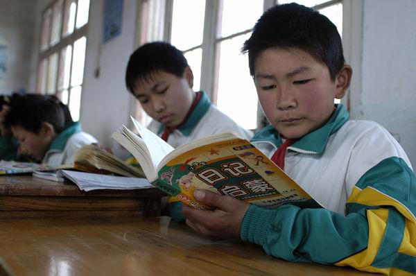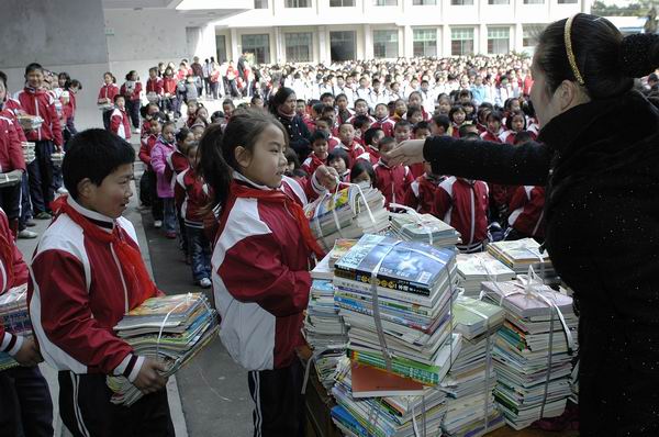 下午,襄樊四中义教部和襄樊47中学的学校领导及8名学生代表一起来到了谷城庙滩,将活动捐赠的书籍送到了熊营中心小学师生的手中。8位同学还来到了小学六年级的教室,亲手将书递到山区孩子手里,同学们在教室里共同看书,互相交谈,并互留联系方式。他们将在今后的生活中,共同学习、共同成长。