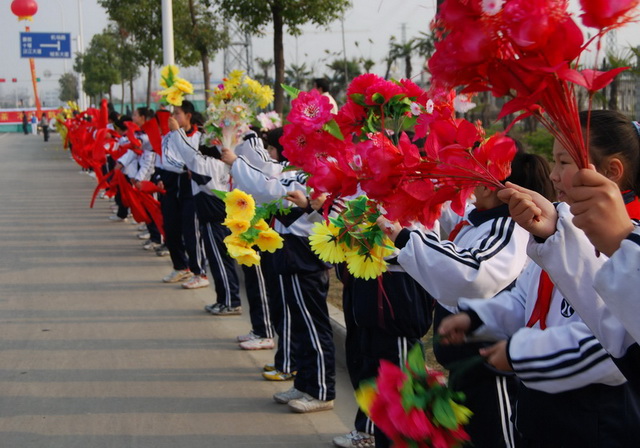 少先队员们夹道欢迎远道而来的客人们