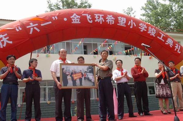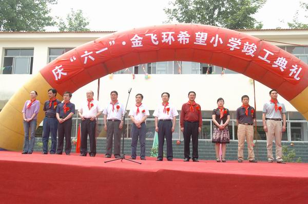 在落成仪式上,希望小学少先队员代表为领导和来宾敬献了红领巾,襄城区委副书记、区长袁德芳和襄樊金飞环彩色包装有限公司总经理蒋祥瑜共同为希望小学揭牌,襄城区、襄阳区、樊城区三所金飞环希望小学向金飞环彩色包装有限公司和团市委回赠锦旗。襄城区委副书记、区长袁德芳同志代表襄城区委、区政府对金飞环希望小学落成表示祝贺,同时对香港贵联集团的爱心之举表示感谢。