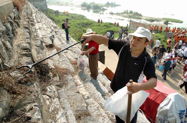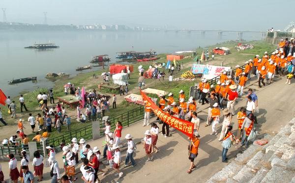 6月5日是第38个世界环境日。一大早,襄樊团市委带领招募的机电工程学校、职业技术学院、中房公司、三技校等单位的500余名青年志愿者,头顶炎炎烈日,手拿捡拾垃圾的工具,来到汉江两岸,参加“我爱汉江母亲河”活动。汉江两岸挂满“关爱水资源、保护母亲河”,“同在蓝天下、爱我汉江水”等醒目的条幅。