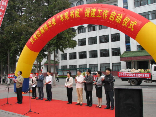 启动仪式上,黄德华市长作了重要讲话,武汉工程大学、襄樊学院、职业技术学院团委负责人为谷城、保康、樊城的村代表捐书,黄市长、李局长、梁书记分别为谷城、保康、樊城的村代表授“共青团农家书屋”牌匾。黄堡村主任熊文平作了感谢发言,武汉工程大学田勇老师代表捐赠方发言。