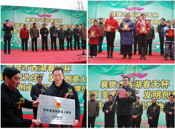 1月9日,襄樊市西湖春天杯“节约资源,变废为宝”发明创意大赛颁奖暨青年就业创业见习基地授牌仪式在襄樊市人民广场西湖春天淘宝城举行。市人大副主任徐建初、市政协副主席郭光福,团市委书记龙小红、副书记施海潮,楚天都市报副总编、襄樊版编辑部总编任浩和市教育局、市环保局等相关单位负责同志出席仪式。