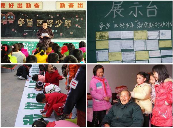 各县(市)区属中小学校少先队也通过多种形式,积极开展争当“四好少年”学习实践活动。谷城县石花镇东风小学、实验小学、赵湾中心小学等学校少先队组织除了开展争当“四好少年”主题班队会以外,还以学习雷锋活动日为契机,丰富活动内容,组织带领少先队员投身争当“四好少年”的学习实践活动。枣阳市第二实验小学、太平镇中心小学、吴店镇中心小学等学校少先队组织以“人人争当‘四好少年’”为主题,向广大少先队员发出“学习胡爷爷贺信,争当‘四好少年’”的倡议,利用升旗仪式、晨会和早读时间重温胡总书记贺信以及《小学生日常行为规范》,把争当“四好少年”与日常行为规范养成教育结合起来,推动活动的深入开展。宜城市洪岗小学在开学主题班队会活动中,以胡总书记贺信精神为主题,相互分享心得,寻找身边榜样,以实际行动融入到争当“四好少年”的活动中。襄城区汉丹小学通过学校板报和宣传栏,积极营造学习宣传争当“四好少年”的氛围,同时在升旗仪式上积极倡导学习实践活动,并开展了优秀班级、优秀中队的评比。保康县团委、少工委以学习雷锋日为契机,组织百余名少先队员深入保康青年林,参加义务植树,拾捡白色垃圾,通过劳动实践磨砺心志,增强体质。老河口市、南漳县、樊城区、高新区等地中、小学少先队组织也相继开展了形式多样的争当“四好少年”学习实践活动,力争使广大少先队员全面熟悉并深刻领会“四好少年”的标准要求,使“四好少年”成为广大少先队员成长进步的导航仪和指南针。