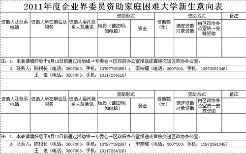 在此向企业界委员发出倡议。捐助本着自愿原则;捐助对象是考取了二本以上的、具有优秀代表性、家庭实有困难的大学新生;捐助形式包括物质(如电脑等)捐助和资金捐助;捐助方式,可以是选择捐助对象直接资助,也可以将捐助财物交由区政协办公室统一安排;捐助截止日期为822日。请求资助的学生情况会及时让委员了解。